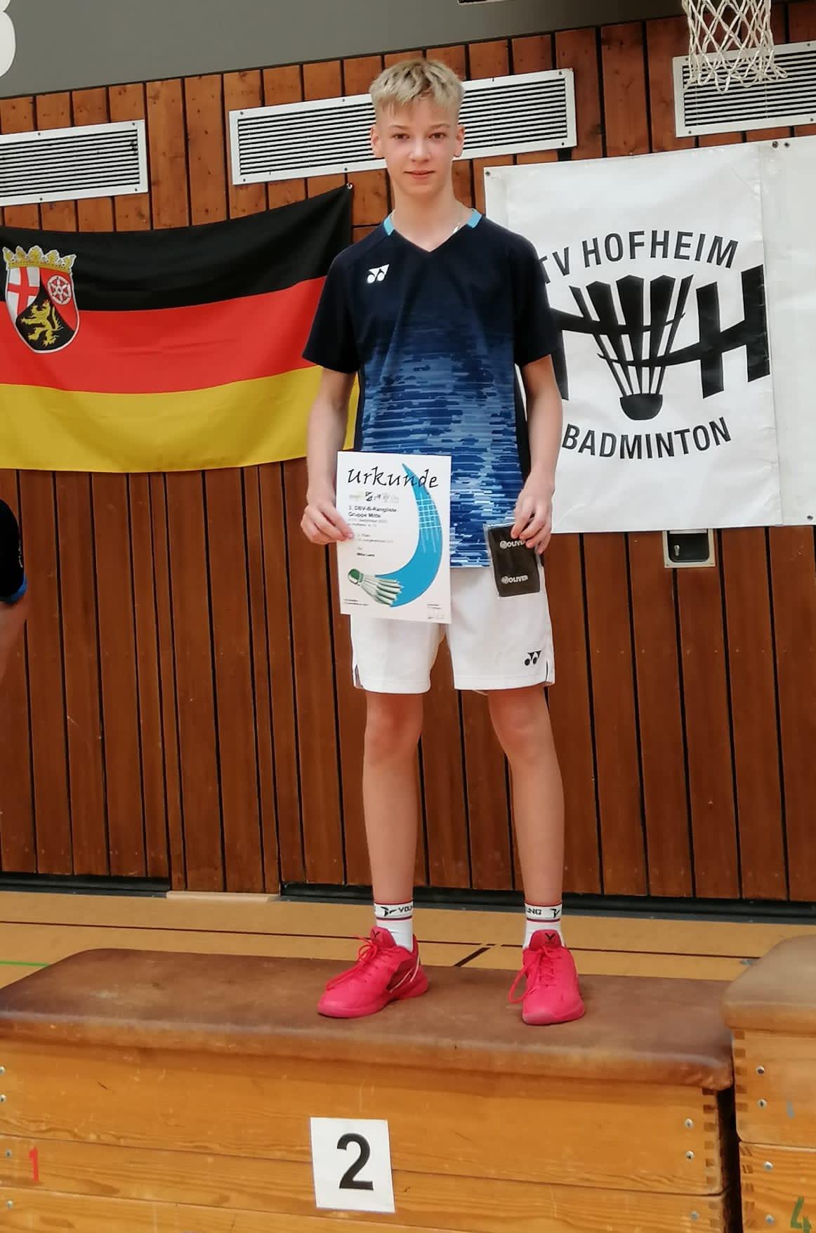 Nun ging es in die spannenden Einzel, Mika war an Platz 4 gesetzt. Das erste Spiel konnte Mika trotz unerwartetem ersten Satzverlust mit 20:22 gegen den Konstanzer Fridolin Heintze dann doch noch in den beiden Folgesätzen für sich entscheiden. Im VF galt es gegen den starken, auf 5 gesetzten Luis Grundmann aus Sachsen anzutreten. Mika spielte äußerst konzentriert und mit sehr wenigen Eigenfehlern und holte sich Punkt für Punkt. Der erste Satz ging unerwartet klar mit 21:13 an Mika, im zweiten Satz lag Mika 11:15 zurück, konnte das Spiel aber dann noch zu seinen Gunsten mit 21:18 zum Sieg drehen – der Einzug ins Halbfinale war geschafft! Hier traf Mika auf den stark aufspielenden Luan Wolber (SSV Waghäusel), den er erst vier Wochen zuvor bei den BW-Meisterschaften, ebenfalls im Halbfinale, noch im 3-Satz bezwingen konnte. Dieses Mal konnte Mika leider dem starken Angriffsspiel des Gegners nicht standhalten und musste beide Sätze mit 15 und 17 Gegenpunkten abgeben. Somit stand Mika am ersten Turniertag das zweite Mal auf dem Treppchen. Erneut Platz 3.