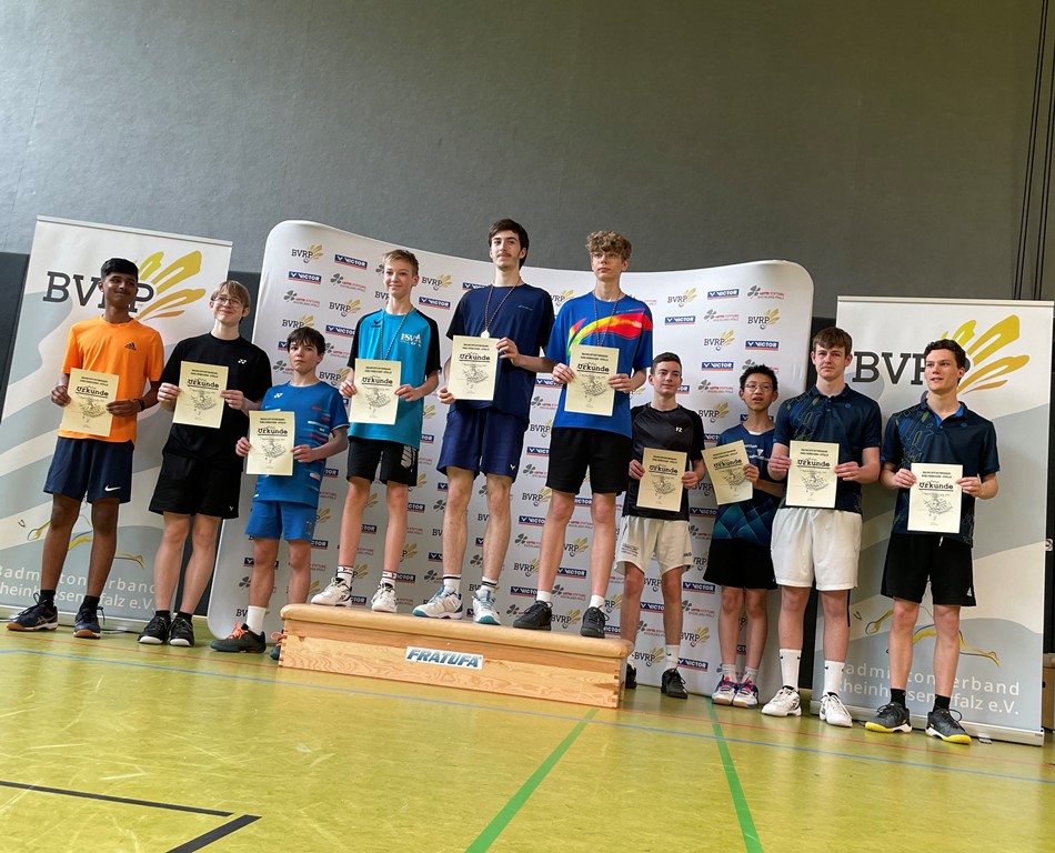 - Mit Setzplatz 4 und Freilos startete Mika im Einzel gleich im VF. Das erste Spiel konnte mit 11 und 17 Gegenpunkten problemlos gewonnen werden. Nun ging es gegen den Topgesetzten Spieler der SG Rheinhessen, Simon Junker. Im ersten Satz konnte Mika sogar bis in die Verlängerung mithalten, musste diesen trotz 2-maligem Satzball dann doch mit 22:24 abgeben. Im zweiten Satz hatte Mika immer mit großem Rückstand zu kämpfen und es stand ziemlich aussichtslos 12:20 für den Gegner. Mika konnte mit großem Kampfgeist und hoher Motivation dennoch die nächsten 5 Punkte für sich entscheiden, verlor dann aber durch eigenen Fehler leider mit 17:21. Das Spiel um Platz 3 gegen Aaron Winter sah dann zunächst mit 21:11 im ersten Satz gut machbar aus, aber der Gegner wurde wohl gut gecoacht und konnte den zweiten Satz mit 21:18 für sich entscheiden. Der Entscheidungssatz endete dann auch 21:18, dieses Mal aber für Mika J.