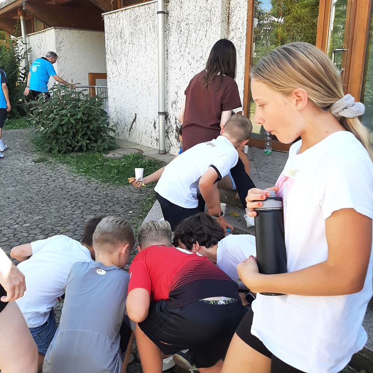 Die Übungen sollten auf das freie Spielen und das Abschlussspiel „Mäxle“ vorbereiten. Das Hit & Run Spiel, bei dem jede Spielerin und jeder Spieler seine drei Leben so lange wie möglich verteidigen musste, sorgte zwar für viel Gewimmel, aber es war deutlich erkennbar, wie die Kids immer besser trafen und schneller wurden.